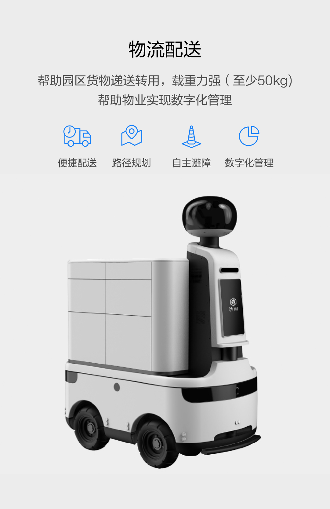 能帮助园区货物递送转用,载重力强(至少50kg) ,帮助物业实现数字化管理